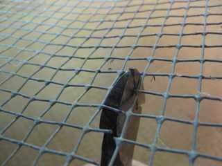 Monte sin apretar las dos partes en la tela metálica formada. Centro de la parte superior sobre los montantes y marque las ubicaciones de los orificios en los bordes exteriores de los montantes. Perfore agujeros de sólo lo suficientemente grandes como para el cable.