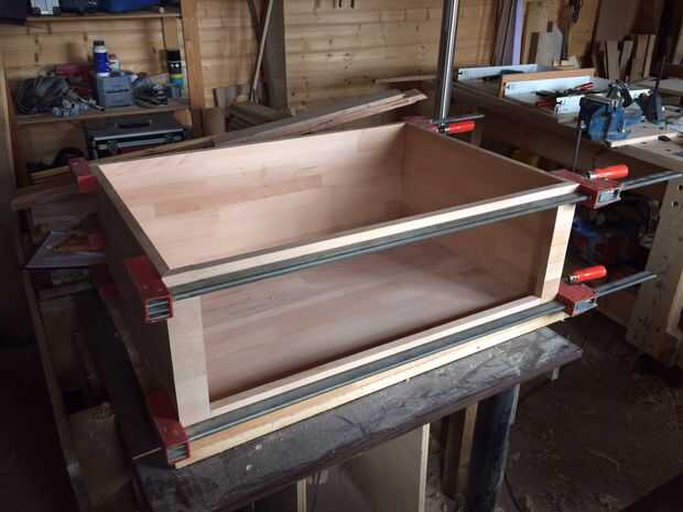 El cuerpo de la tabla se pega junto con espigas domino. Quería usar tornillos como pocos como sea posible porque esto será utilizado por los perros y quería metal como pocos como sea posible para evitar oxidación si en contacto con líquidos