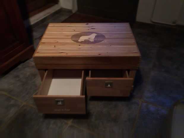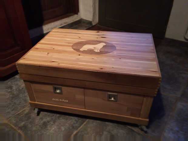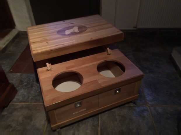 Este tazón de fuente del perro fue creado a partir de vieja madera de la plataforma y talladas a mano con hojas decorativas y mi nombre de perros.Una estructura muy simple.Tope simple tableros juntos y pegar encima. Usted necesita ser más larga y más