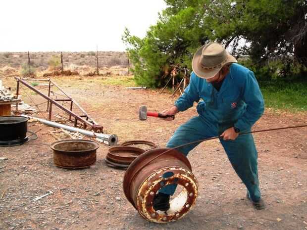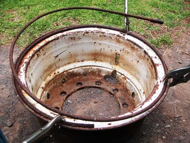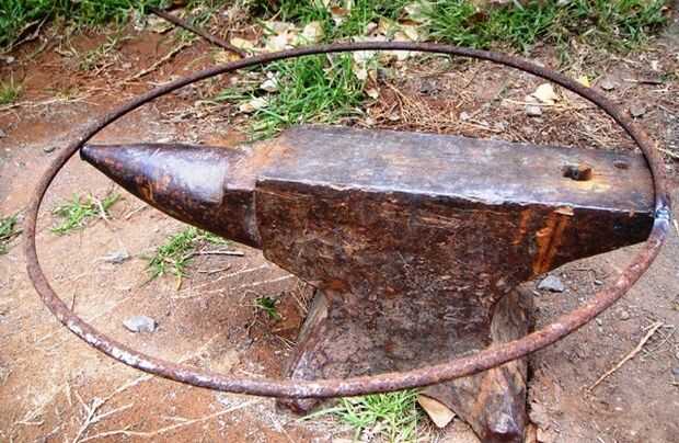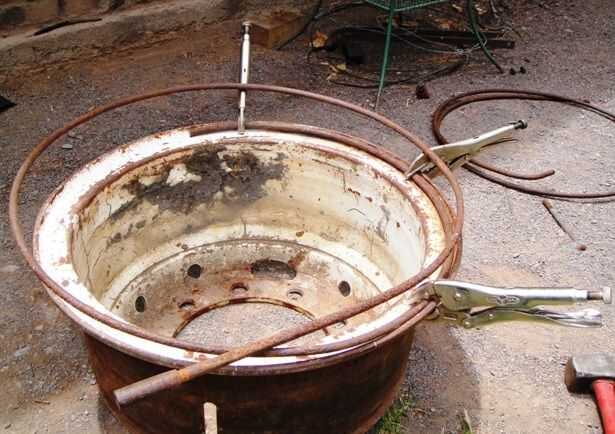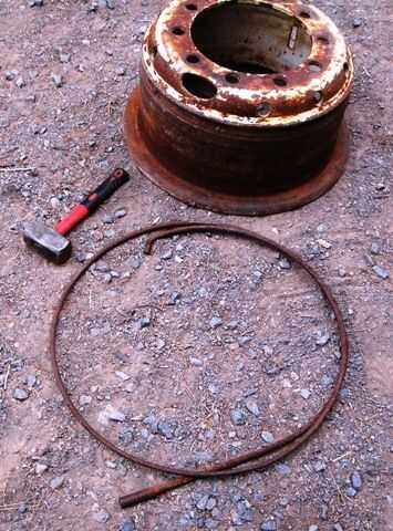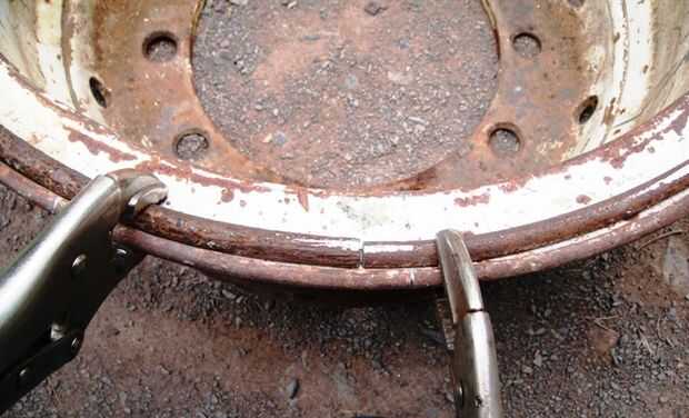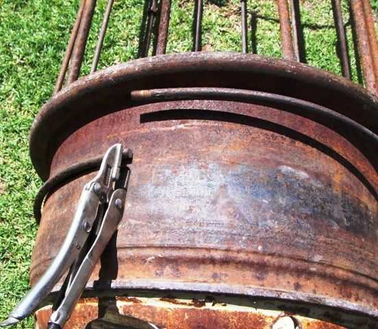 Al principio puso la punta de la varilla a través del orificio de la válvula de la llanta, había martillado abajo entonces envuelve la varilla alrededor del borde y cortar la punta doblada (cuadro 2). Más tarde descubrí que si el agujero de la válvula permite que era mucho más fácil sostener la barra con un vice grip, conduce a una curva de asfixiar y menos desperdicio (cuadro 3). Entonces usando 3 apretones de vicio que puso la barra en el borde, el primero de ellos no se quitan. Las dos siguientes evitamos mutuamente con el fin de tirar de la varilla en un bonito anillo correctamente (cuadro 4 y 5). Corte extra poco, abrazadera y soldadura (picture6). Quitar la llanta y golpear hasta que todas las torceduras hacia fuera. (7)