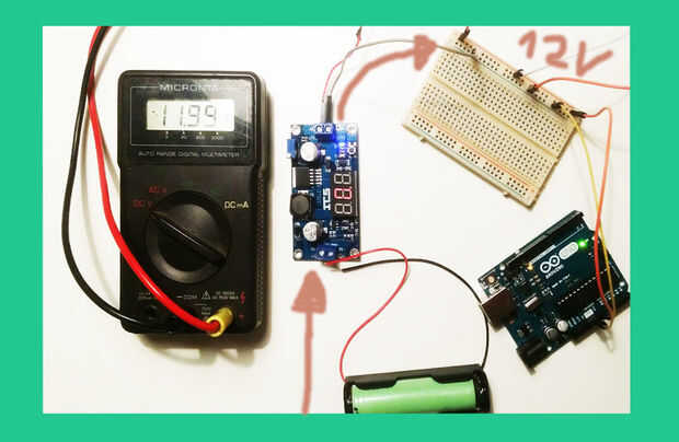 batería a un paso en Junta. Paso hasta 12v. El arduino uno, así como la mayoría otros proceesors micro puede aceptar 12v como entrada y la misma entrada pueden encender su bombilla de 12v. Utilizar un regulador mosfet o voltaje en los pines de arduino entre la batería y la bombilla de 12v para poder controlar con señal de E/S de 5v de arduino. Vea el diagrama arriba, los multímetro sustituye la bombilla.
