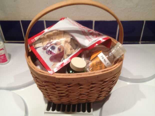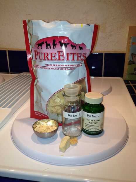 Piezas de crumble-hasta uno o dos de pollo deshidratado y colocarla en un bol pequeño de acero fino. Añadir la pastilla #1 (una pastilla en cuartos) y #2 (entero) de la píldora. Opcionalmente, puede al comienzo con bonito escamas. Generalmente esto es innecesario, pero puede ser útil si ella come alrededor de sus píldoras.