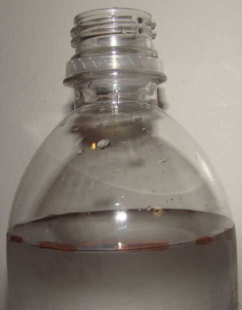 Relleno o drenaje el líquido (agua) hasta que alcanza el estrechamiento de la parte superior de la botella.  Marcar el nivel con el marcador.