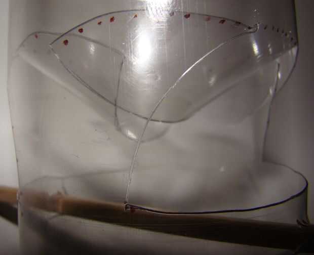 Cortar una pequeña X en ambos orificios y empujar un palillo a través de ellos, esto servirá como la percha de aves. Cuánto por debajo depende de tipo de aves, el más grande es el pájaro más la distancia debe ser.