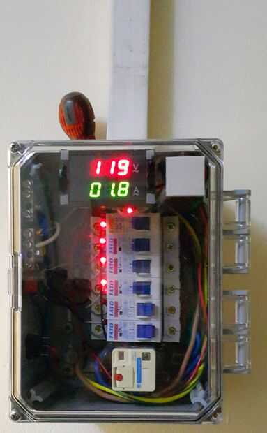 La salida de mi inversor 120v que conectado a un tablero que construí con un interruptor de transferencia automática. Abajo está el instructable que publiqué para ese proyecto: