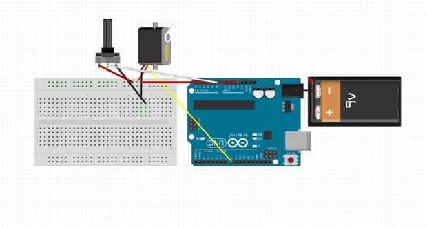 Alambre a continuación el pin central del potenciómetro al puerto A0 de Arduino. Luego conectar la clavija final en una fila en el tablero de pan. A continuación conectar el puerto central del motor Servo con la misma fila en el tablero de pan, en esa misma fila un puerto con el puerto de 5v de Arduino para dar la potencia Servo y potenciómetro de alambre. Conecte el puerto amarillo del Servo con el digital puerto 9 de Arduino y conecte el puerto negro con la ranura de la tierra restante. Para completar el circuito, conectar el Arduino mediante un cable USB y cargar el código del programa arduino. (el código se puede encontrar en el siguiente paso)