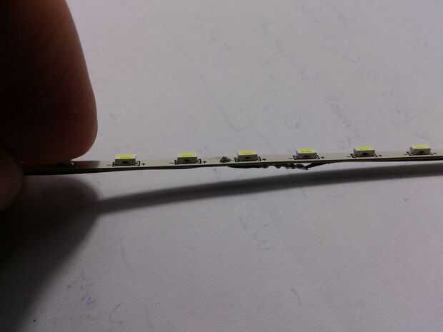 Vamos a comenzar con la tira de LED, las conexiones de energía son generalmente muy pequeñas y muy cerca unos de otros. Si son buenos en la soldadura y tiene mano firme de un cirujano se suelde los alambres fácilmente, no lo hacía, así que en vez de perforar agujeros donde las zonas no grabadas negativo del PCB de cada serie, entonces he quitado la pintura exponiendo el cobre, pasé los cables aunque los orificios y soldada en su lugar, uniéndose a ellos para conectar la serie de tres LED