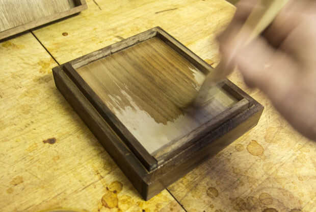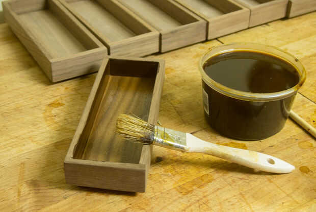 También puede utilizar una esponja, paño de algodón o francés pulido almohadilla para aplicar goma laca. En estas cajas y cuencos de tamaño similar, estoy usando un pincel de 1-1/2" de ancho. Para superficies más grandes, use un cepillo más ancho.