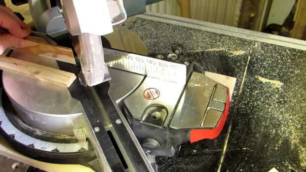 Ahora viene otra función de la guía auxiliar. Para realizar el segundo corte, primero baje su mitre (sin encender) la hoja de sierra y tope su cerco contra él. Usted puede ser que necesite hacer un corte, sin embargo, si el ángulo es hacia el lado equivocado. Ahora sostenga en su lugar y levantar otra vez la hoja. Colocar la pieza cónica marcada contra él y alinearlo para que la marca está en el borde mismo de la guía - puede que tenga que mirarlo desde atrás para esto. Sólo asegúrese de que no mueva el tope-guía auxiliar, y debe establecerse para un corte preciso.
