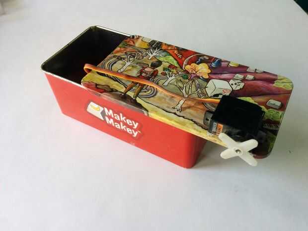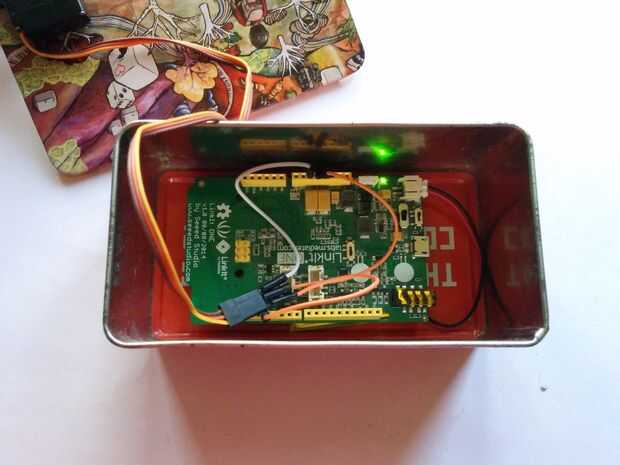 A continuación, necesitamos un gabinete para montar el servo en y en que va el Linkit y la batería de iones de litio. El servo debe estar pegado a la parte superior de la caja o la tapa de la caja, usé cinta de doble cara para hacerlo posible.