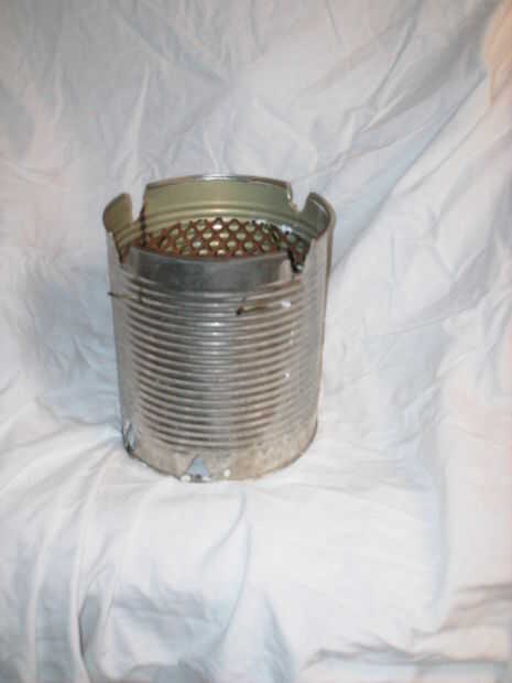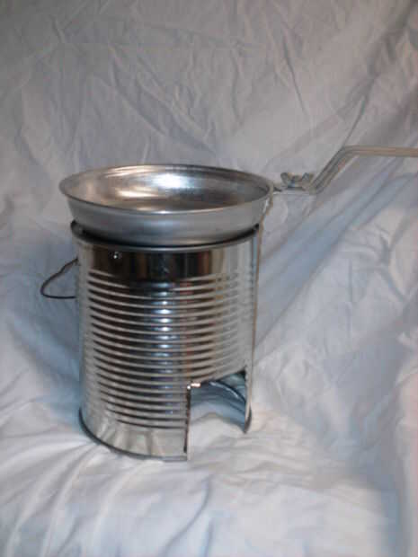 En la segunda imagen se muestra otra versión que hizo mi hermano. La superficie de cocción es más de una malla de acero - no sé el nombre real - y es sostenido por un colgador de ropa a través de la can.