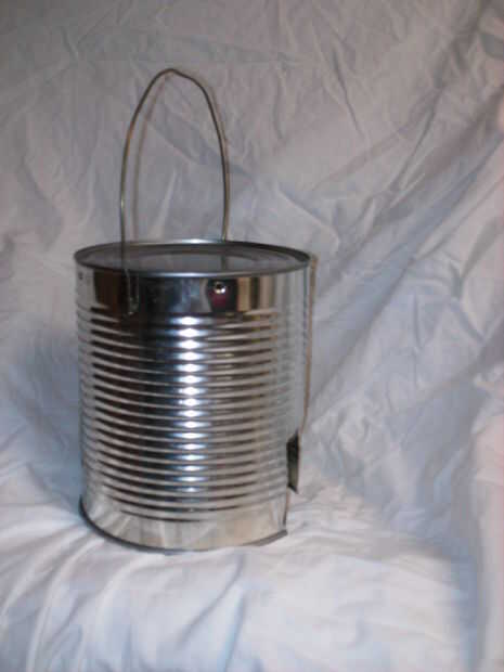 Después de un incendio, no quería tener que recoger la poder sí mismo, por lo que añadió una manija de perchas de alambre. Simplemente, dobló el alambre en la forma y el martillado/doblado/rompió airadamente fabricado los extremos más planos con el martillo para que no caiga por los agujeros. Sólo hice una manija en la parte superior, pero cabría añadir otra en la parte inferior para que la can podría sostener engranaje cuando no es cocinar los alimentos. O quizás no. El diseño depende de usted!