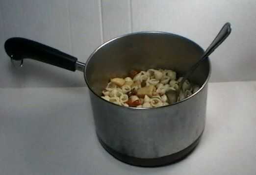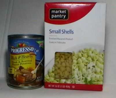 Me decidí a cuantificar qué tan bien funciona en el desayuno esta mañana. Desvió de mi desayuno no perecederos estándar que es la harina de avena. Decidí tener una lata de Progresso rico y suculento bistec y patatas asadas de teja. Una lata contiene 260 calorías y tiene un volumen de 2 tazas. Había hervido 1 taza de "cáscaras", que contiene alrededor de 550 calorías. Después de la cocción, 1 taza de fideos se ha convertido en 2 tazas de fideos. La marca se muestra, que es el que usé hoy no es la marca suelo comprar. Una taza de fideos El Mexicano me costó unos 37 centavos de dólar. Así que por 37 céntimos puede doble el volumen de los alimentos y más del triple de las calorías. Puedo extender 50 latas de sopa por muy por debajo de $20.00. Lo que trato. Después de drenar las cáscaras agregué la derecha de la sopa de la lata para las cáscaras sin cocinar la sopa. Si esto hubiera sido una situación de verdadera emergencia habría hecho un par de tazas de café instantáneo con el agua que fue drenado. Sólo pude comer la mitad para el desayuno.