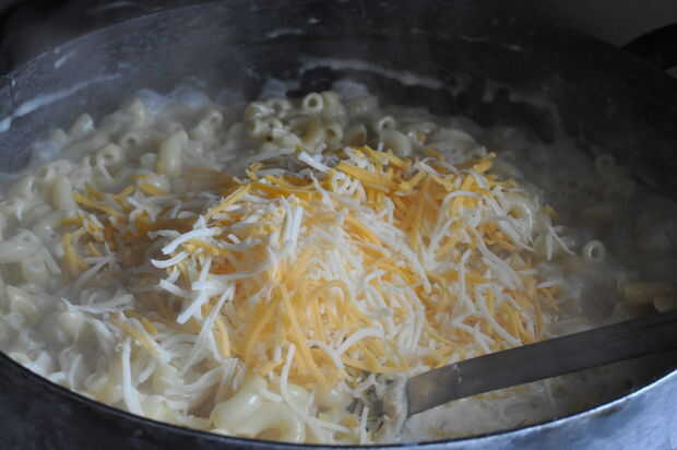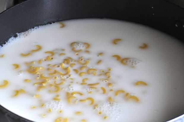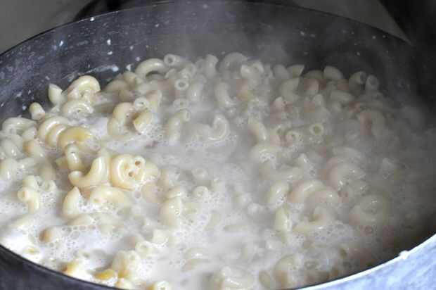 1. Agregue 3 tazas de agua, la leche evaporada y macarrones juntos en una sartén grande. Caliéntalo a fuego medio alto, revolviendo constantemente para evitar que se quemen, hasta que los macarrones se ablande y el líquido se haya espesado ligeramente.