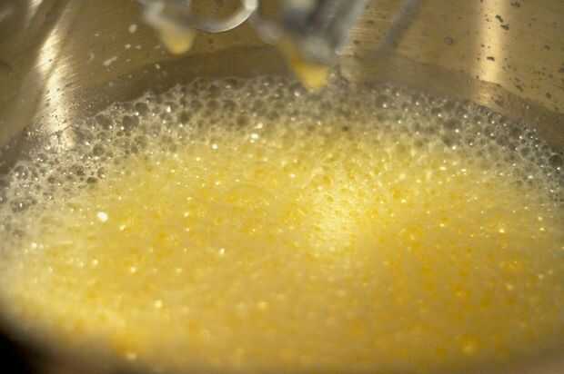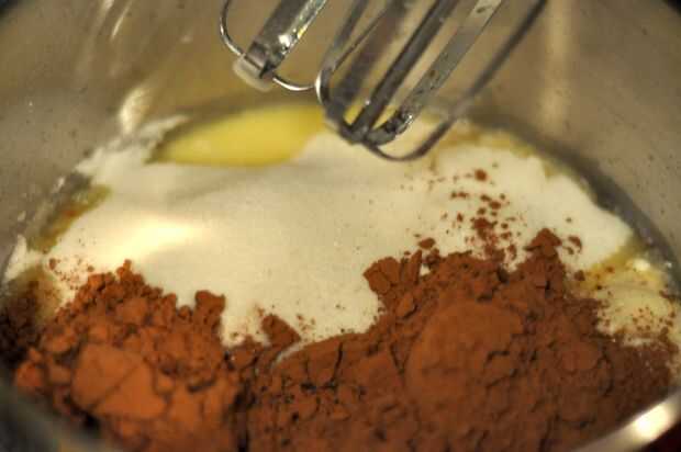 2. Tamice la harina, azúcar, bicarbonato de sodio, en polvo, sal y cacao en la mezcla de líquido y mezcla hasta que quede suave.