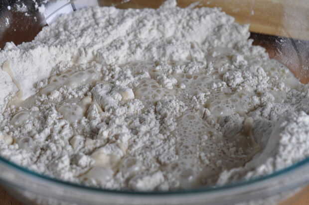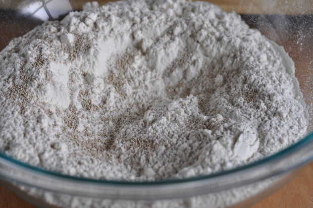 Mezcle la levadura seca y 2 tazas de la harina en un tazón grande.