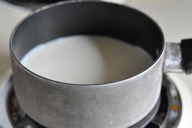 Caliente la leche, el azúcar y la sal en baja hasta que caliente, 110-115 grados F.