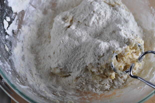 Vierta la mezcla de leche caliente en la mezcla de harina junto con los huevos, el extracto de almendra y el cardamomo y mezclar bien a mano o utilizando el accesorio de gancho de la masa de un mezclador.