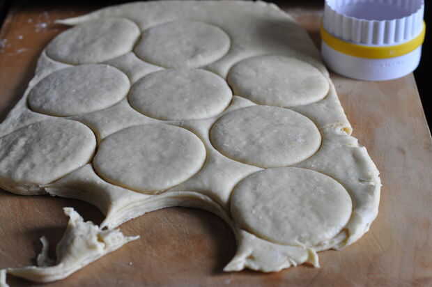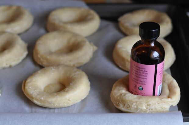 Enfriar la masa en la nevera antes de que se extienda por la vez última. Usando un cortador de galletas grande, corte la masa y colocar en una placa para horno forrada con papel pergamino. Permita que la masa suba otra vez levemente, haciendo muescas en el centro el relleno (la parte inferior de mi Extracto de almendra era el tamaño perfecto).
