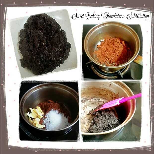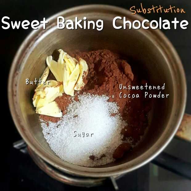 1 onza dulce horneado Chocolate = 3 cucharadas sin azúcar cacao en polvo + 4 cucharaditas de azúcar + 1 cucharada de mantequilla, manteca o aceite vegetal.