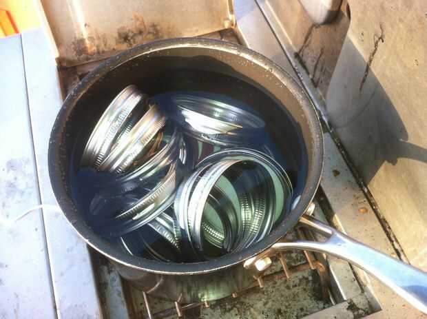 Coloque las tapas y bandas en una cacerola aparte y cubrir con agua. Coloque sobre la estufa y el calor del agua, pero no hervir. En alguna parte alrededor 180 grados F es perfecto.