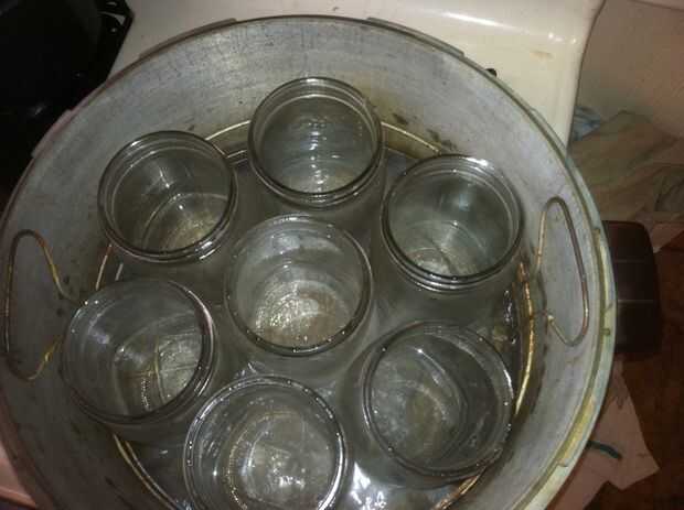 Poner los frascos en la olla de presión (sin tapa) y llene con agua hasta aproximadamente 2 pulgadas de profundo. Colocar en la estufa y poner a hervir. Esto le llevará mucho tiempo debido al gran volumen de agua.