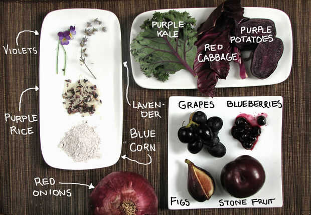 Granos y frijoles: Muchos granos y frijoles tienen variedades reliquia púrpura (arroz, maíz, quinua, soja negra, frijol negro tortuga). Las variedades púrpura tienden a ser un poco más oscuro y más fuerte en sabor. Algunas de estas variedades tienen muy altas concentraciones de antocianinas. Negro de soja tiene muy altos niveles de antocianinas, pero el color de los productos de soya (leche de soja y tofu) de estos granos es sólo levemente afectado. Prohibido el arroz (no el arroz morado en la foto) tiene mucho pigmento se ve negro cuando se seca, pero cuando cocinado se ve (y se convierte el agua de cocción) color morado oscuro. Trate de usar un oscuro, grano morado como una base para una comida puede hacer que un impresionante telón de fondo, especialmente cuando usted está sirviendo junto a hortalizas de llamativos colores.