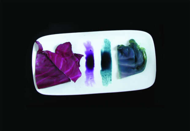 Verdes: Entre verdes, hay muchas variedades que tienen variedades púrpura. Violeta-hojas de lechugas, col, coliflor de morado y púrpura claro, col. Cuando se comen crudas, estas variedades púrpura tienden a tener más taninos que sus contrapartes más verde. Así que si usted está haciendo, digamos, una ensalada de lechuga de hoja roja que puede servir con un dulce o crema vistiendo, en lugar de una vinagreta a base de ácido. Como puede recordar de la discusión de alimentos azul, col roja puede ser hervido y concentrado para hacer un colorante de alimentos, con un pH básico este tinte es de color azul (ver imagen debajo del tinte y hojas). Pero con un pH ligeramente ácido, el tinte es un púrpura intenso. Puede Agregar este tinte púrpura que se forme escarcha o ácida se mezcla para el color de la torta. (Aunque probablemente solo añadiría un puré de baya.)