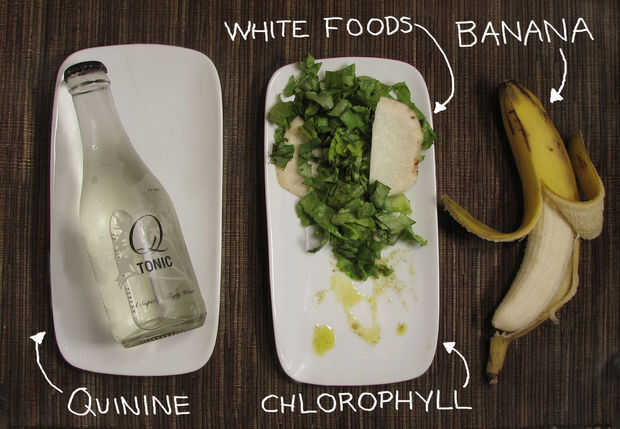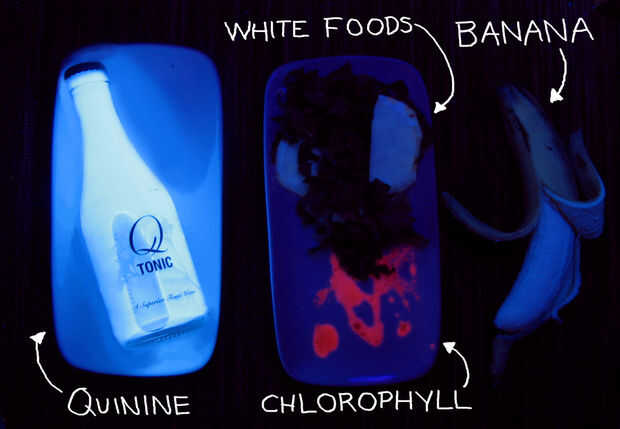 Para terminar al final de mi discusión sobre colores en el mundo de los alimentos vegetales, terminamos con el tema algo raro de alimentos ultra violetas. Hay varios alimentos que son luminiscentes bajo luz ultravioleta, y su comportamiento parece tener nada que ver con las otras clases de pigmentos vegetales. Alimentos que brillan operan bajo sus propias reglas. Tal vez no es la discusión más práctica de alimentos, pero seguro que hace una impresión al apagar las luces de arriba y encienda una luz negra, y cambia el aspecto de todo. ¿Y que no parece un poco emocionante comer algo que está encendida? O incluso al ver algo familiar se ve totalmente diferente, bueno, en una nueva luz.
