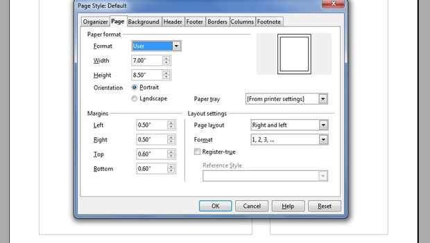 Tire hacia abajo el menú Formato y haga clic en página. Seleccione la orientación vertical. Para mis propósitos, configurar el tamaño de página para 7 pulgadas de ancho x 8,5 pulgadas de alto con márgenes laterales de 0.5 pulgadas y de 0,6 en la parte superior e inferior.