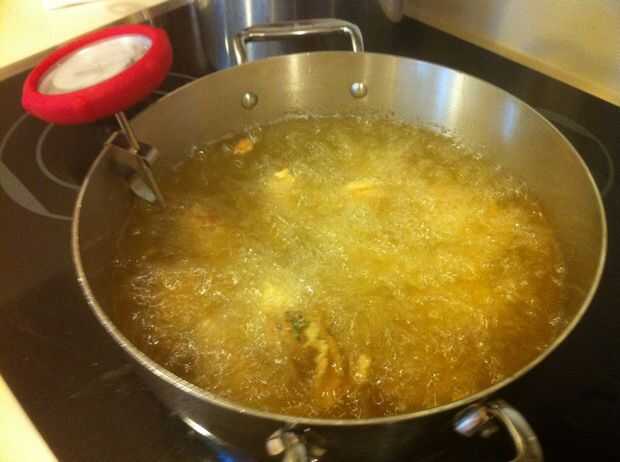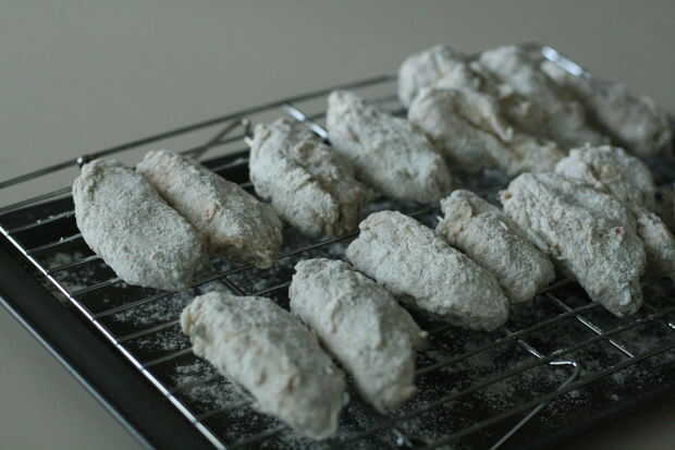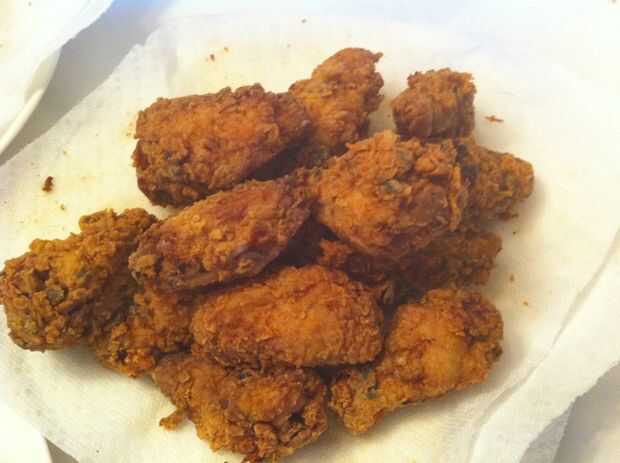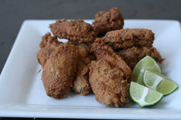Mientras se está calentando el aceite, en un tazón grande, batir harina, ajo en polvo, jengibre en polvo y sal. Quite ala del adobo y mezclar en la harina hasta que estén completamente cubiertas. Reposar en rejilla y repetir con las alas restantes. Una vez que el aceite ha llegado a 325 grados, agregar suficiente alas para que tengas espacio para revuélvalos, si es necesario. Fría para unos 12 a 15 minutos, hasta que se doren. Retirar del aceite y escurrir sobre toallas de papel.