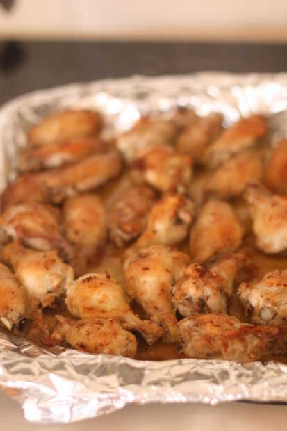 Precalentar el horno a 350. Asadera con papel de aluminio de la línea. Asado de alitas de pollo para 40 a 50 minutos.