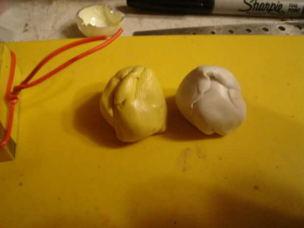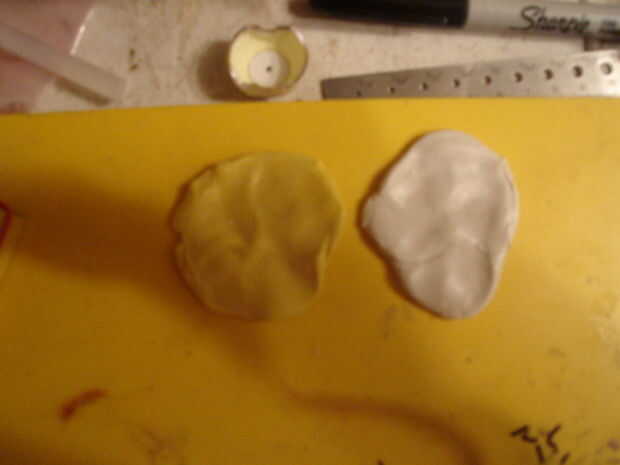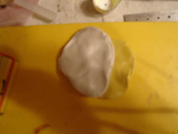 OK antes de que estamos listos para la mezcla el molde compuesto, asegúrese de que cote dentro del marco del molde y la superficie que está trabajando y el ojo de Elvis con su desmoldeo. Permite mezclar la masilla, ahora que estamos listos. Tomar 4 gramos de la parte A y parte B de la masilla de molde increíble. Aplanar cada parte con las manos en una tortilla. Después de haber hecho este lugar los 2 juntos y mezclar a mano hasta que tenga un color uniforme, pero no se mezclan demasiado bien la masilla comenzará a endurecerse y vas a tener que empezar de nuevo. Una vez que la tienes mixta lo coloca en el marco y presione en plana y rellenar las esquinas de la estructura del molde. Ahora es tiempo de colocar el ojo en el centro de la masilla, presione el ojo en el centro de la masilla hasta que usted alcance el borde del ojo pero no la presione hasta que la parte inferior de la superficie están trabajando en Asegúrese de que usted tiene por lo menos 1/8" de espacio en la parte inferior del ojo y la superficie del molde. Si usted hace este marco exactamente como lo hice y pesa la masilla no tendrá que preocuparse por golpear la parte inferior. Nota Si usted golpeó la parte inferior de la superficie comience sobre y añade más masilla!