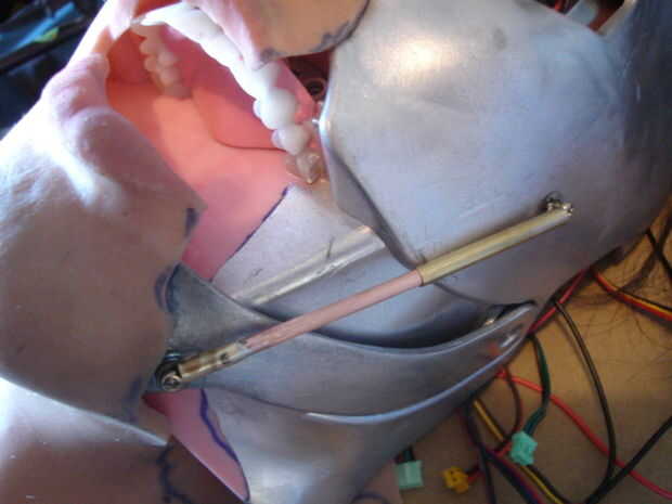 Siguiente vamos a instalarlos en la cara. Use 2 arandelas en la mandíbula y una arandela en la mejilla y perfore un pequeño agujero donde desea colocar el pistón. Una vez que encuentras un buen lugar que quieras instalar un pequeño tornillo en las arandelas de la mandíbula y la mejilla autorroscante. Compruebe y asegúrese de que el pistón de la mordaza se extienden todo el camino hacia abajo y mover con la boca, si no vuelva a ajustar la ubicación. Ver las fotos de abajo: