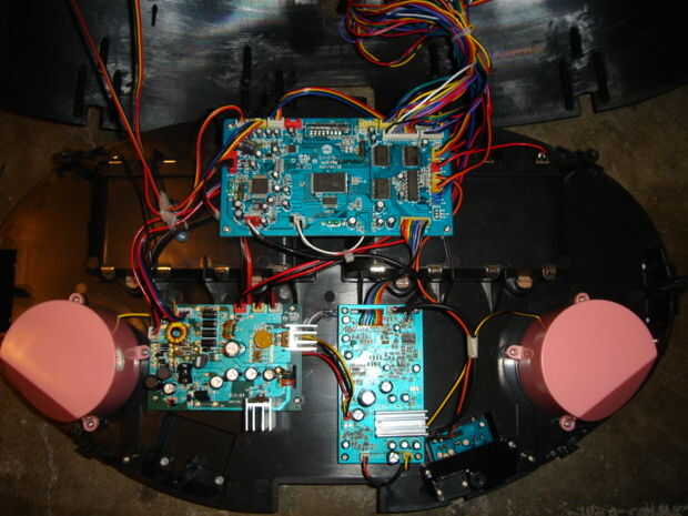 Final de apertura de la base del torso. Tenga cuidado de no tirar de los alambres demasiado firmemente. En la base, usted verá los altavoces rosa; uno en la izquierda, una a la derecha. El PCB en el extremo izquierdo es el amplificador de audio, y el centro superior es el principal PCB (o "cerebro" si se quiere). Centro frontal es la interfaz de audio que integra el micro teléfono y entrada de audio de la CPU y salida a los altavoces.