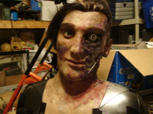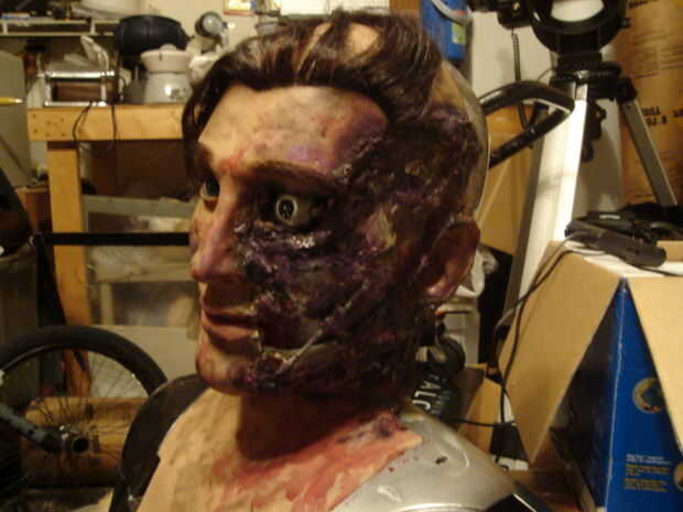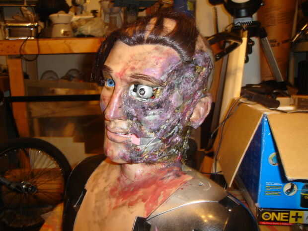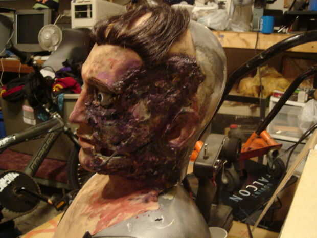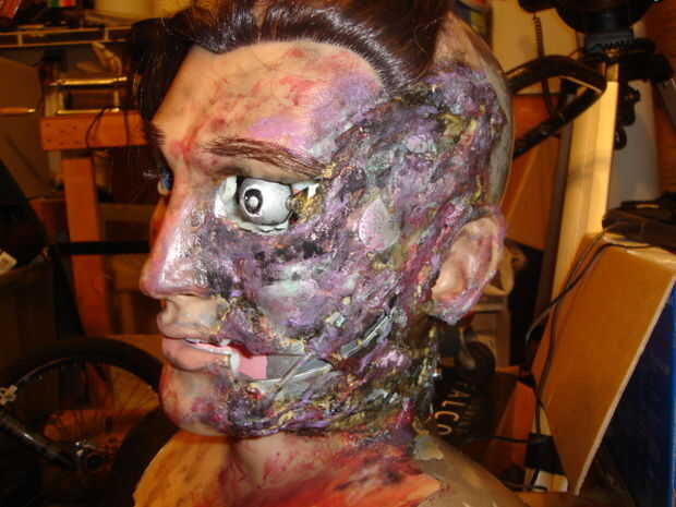 Que la nueva piel seca alrededor de un día hasta que adquiere un color más oscuro. Ahora es el momento para la pintura. Pinté esto usando la pintura de la máscara de goma de www.monstermakers.com. Primero añadí que la pintura carne med añade algunos negro para mostrar Resumen después de que agregué púrpura y rojo para el efecto y un poco blanco, verde y amarillo para una mirada mejor dejando que cada capa seque antes de agregar el siguiente color de la contusión. Ver foto de abajo: