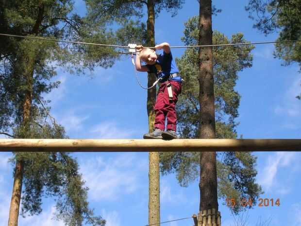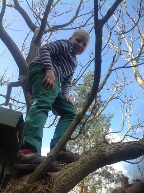 Las fotos muestran su nuevo encontrado amor de escalada, la primera en el jardín y el segundo en GoApe, un curso que combina la escalada de árbol importante, balanceo y zip los cables.