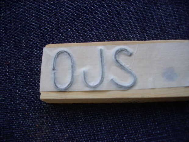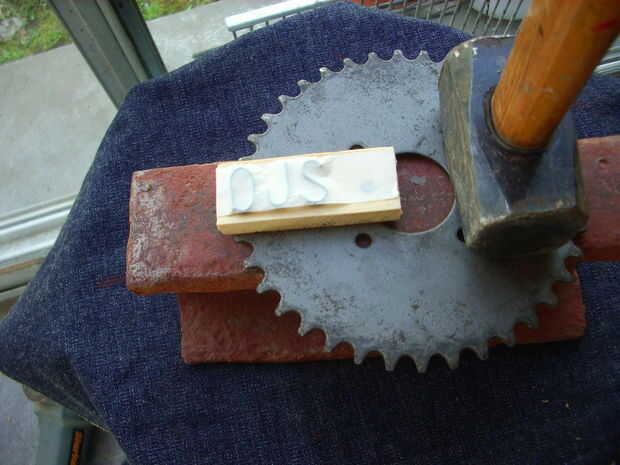 Poner la madera con las letras sobre una superficie sólida, porque lo que viene es no hacerlo sobre la mesa del comedor. Usé mi viejo yunque y un engranaje de la motocicleta plano fuerte.