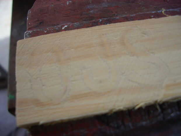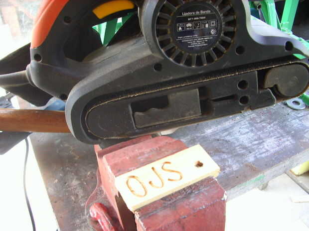 Tengo la suerte de tener una lijadora de banda, pero si no, no hay excusa. Tienes que darle duro y a la arena para eliminar los surcos de la madera. Pero cuidado, no retire el fondo de los surcos. Letras deben ser legibles todavía. También puede utilizar un plano de jack, un cincel, una escofina, cualquier cosa que sirve para desbastar.