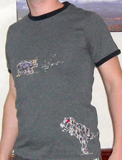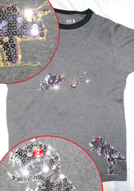 By combina la ropa de la tienda de segunda mano ofertas con impresiones de computadora que usted puede crear fácilmente su propio diseño único de la camiseta. Elegí una camiseta gris estándar como la base y un top de lentejuelas para mujer para el alivio.Mi diseño de socorro es un par de mis dinosaurios favoritos.
