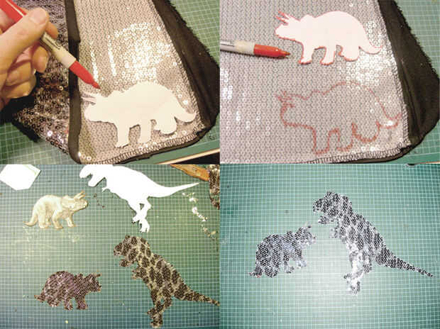 Ubicar un buen parche de tela en su paño de donantes. Posición y gire sus recortes de imágenes de papel, luego contornear la imagen con un marcador. Opté por un marcador de color, dependiendo de la tela de que su color de marcador puede sangrar a través. El efecto es impresionante.