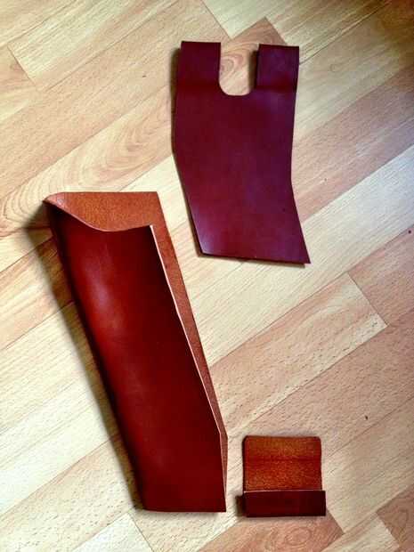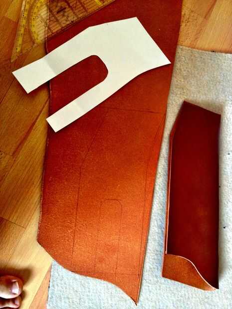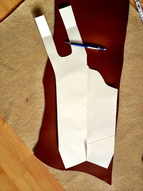 hice una plantilla de papel que he probado en mi pierna para garantizar que tiene la forma correcta. Inicialmente quería hacer la parte principal y los lazos de la correa de una sola pieza de cuero. Pero el cuero es mucho más bonito en la parte delantera, así que decidí utilizar un enfoque de 3 piezas. Asegúrese de que usted corte el cuero un poco más grande que la plantilla ya que el doblez de la piel en la forma torcida utilizará material un poco más. Para obtener una ventaja agradable usted será más tarde corte uno o dos milímetros de todos modos.