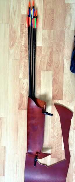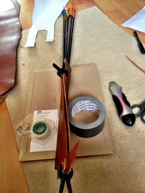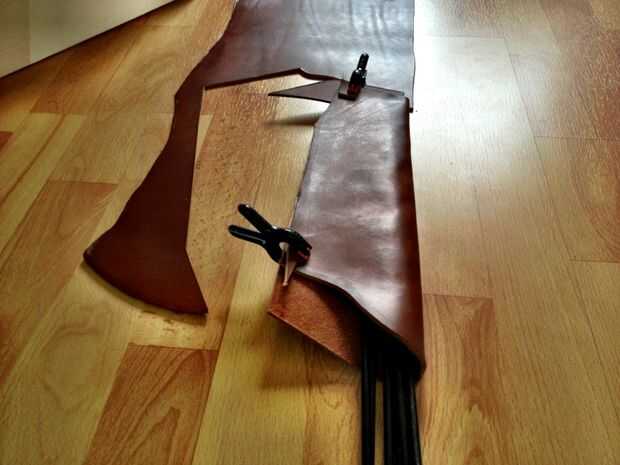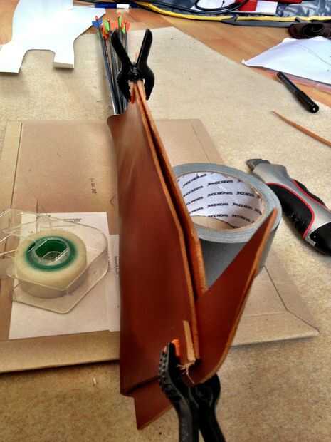 Una vez tengas las tres piezas puede empezar a poner en forma. Mientras que los lazos de la correa (Asegúrese de que estén lo suficientemente amplia como para el cinturón) y perneras son bastante fáciles y explicativo, la parte principal es un poco complicada. Empape la piel completamente con agua tibia por unos minutos. Una vez que se pierde la rigidez y es moldeable se puede doblar. Para obtener el canal de las espinas de flecha temporalmente he insertado un trozo de tubería de PVC. Rellenas de un trozo de tela en la tapa de entrada para hacerlo destacar. Esta aleta hará realmente conveniente para poner las flechas en la aljaba. No tienes que buscar donde está la entrada, sólo poner el punto de la flecha a la aleta y se guiará en. Usé varias abrazaderas para unir la piel mientras se seca. Asegúrese de que utilice algo entre las abrazaderas y el cuero mojado. De lo contrario terminarás con las marcas de presión profunda donde las abrazaderas han sido. Lo mejor es cuando empiezas a dar el cuero la forma torcida. Será mucho más fácil de unirlo correctamente más adelante cuando ya tiene esta forma. Deja secar durante la noche y tomar una cerveza.