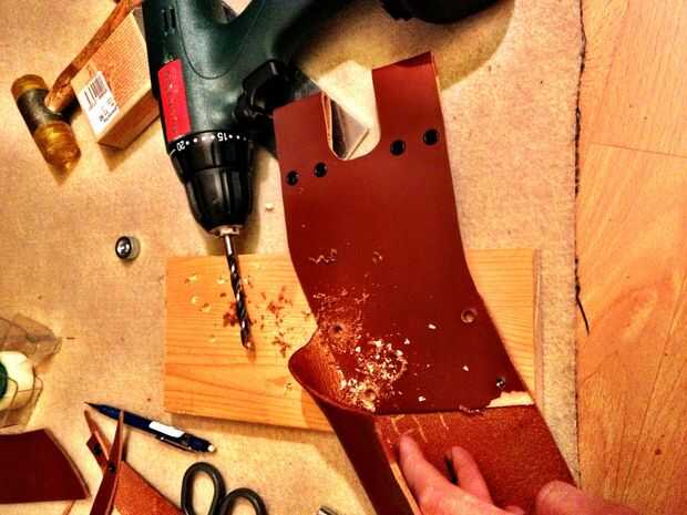 Exactamente como en el paso anterior, la arena por un borde de la parte de bucles de correa para asegurar una ventaja agradable. Inserte la correa bucles en la aljaba y pegar hacia abajo. Una vez que está seco puede hacer agujeros y remache todo juntos. En el orificio inferior de la derecha he usado un tornillo de chicago. Por supuesto también puede utilizar remaches más. Tuve (apenas capaces de conectar dos capas de piel) solamente cortos remaches y tornillos más largos de chicago. Usé los tornillos chicago por todas partes que se conectan 3 capas de cuero.