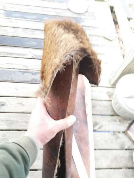 Quería la aljaba para sostener sobre 6-8 flechas por lo que estima que sería necesario un tubo de unos 3 a 4 pulgadas de diámetro. Al principio pensé que quería el pelo en el interior para que ayudaría a silenciar las flechas como se llevan. Este pelo fue cómo originalmente terminé la piel cuando terminé así que naturalmente llevó a cabo esta forma de bronceado. Iba a poner el collar de la piel hacia el exterior.