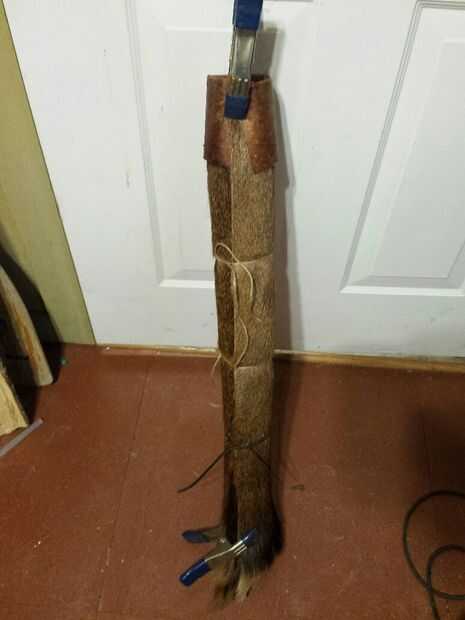 Tomó mucho rodar para conseguir la piel para envolver en forma de tubo en la dirección opuesta que fue curtida en. Tuve que clip en cada extremo con una pinza para la ropa tipo mano abrazaderas y ate el tubo en el forma y dejarlo establecido durante la noche para mantener la forma deseada.