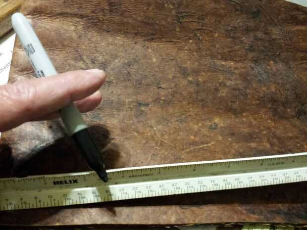 Yo solía una escala triángulo diseño el espacio entre orificios y una pluma Sharpie márquelos. Quería asegurarse de que tengo el mismo número de hoyos por lado y que era tan simple como contar puntos. Utilicé una perforadora de cuero para saltar los agujeros. Lo planeado originalmente usando una puntada corriente con cordón de cuero pero en la primera puntada que cordón de cuero de 1/8 de pulgada tiende a tirar pelo en el agujero como se cose el encaje se bloquea y no cose nada.