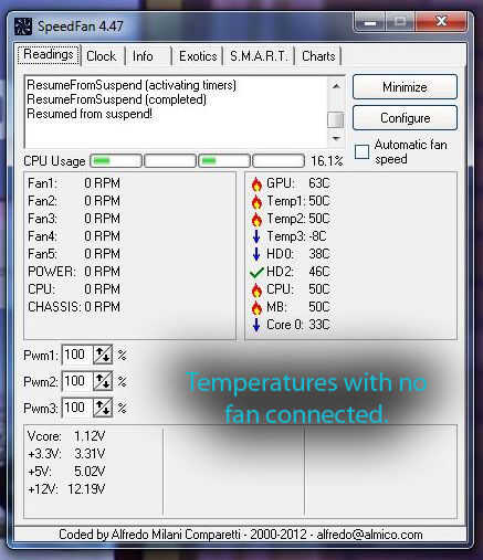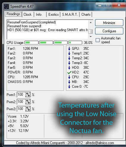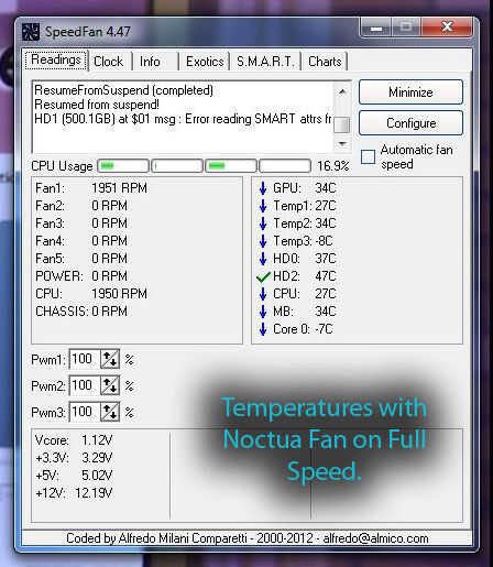 Para enfriar la CPU, he tenido que añadir un ventilador a la CPU como la CPU temp. rodar hasta 50 grados C sin programas que se ejecutan. El único ventilador silencioso a un precio razonable que pude encontrar fue el 80x80x25mm de Noctua. El otro sin marca ventilador probé sonaba como un secador de pelo. El Noctua también tiene un bajo nivel de ruido y conector de ruido Ultra bajo que reduce la velocidad del ventilador y el ruido. He utilizado el adaptador de poco ruido. Esto mantiene la CPU a un relativamente fresco C. 27Deg Sobresalen del chasis pero otro compromiso.