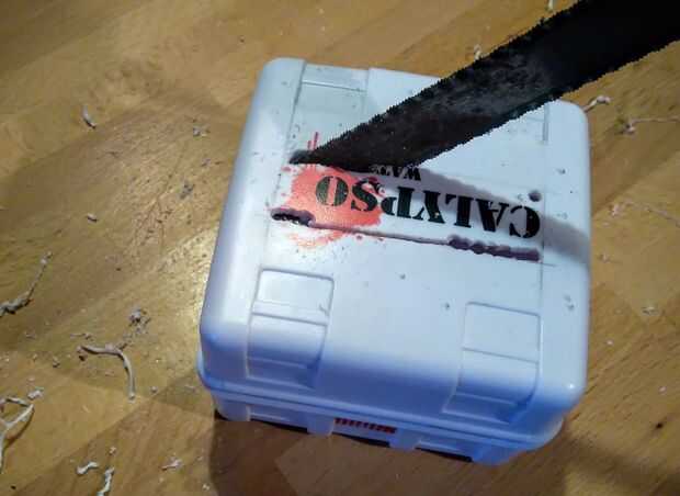 Para recortar esta figura, marque primero el rectángulo sobre la superficie de plástico con un lápiz. Una vez marcado, perfore unos agujeros a cada lado. Asegurándose de que la línea formada por la serie de agujeros es tiempo suficiente para la hoja de la sierra en. En los dos lados más cortos, perforé a sólo los orificios necesarios para llegar a toda la línea, no había ningún punto en el uso de la sierra.