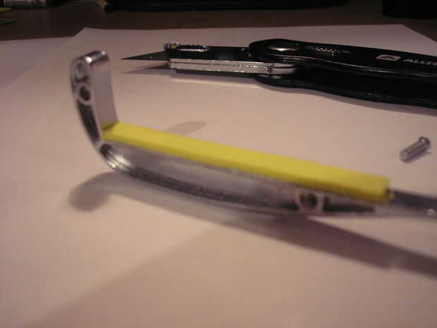 Use un cuchillo para cortar la espuma como se muestra en la imagen. O bien puede hacerlo antes o después de aplicar la espuma. Había pegado la espuma, luego cortar el extremo. Necesitaba utilizar algunos goo para deshacerse de los residuos de pequeña calcomanía.